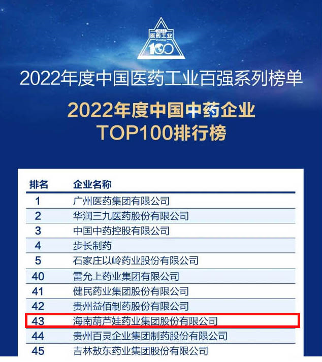 AG8旗舰厅药业集团连续4年荣登“中国中药企业TOP100排行榜”,排名上升至第43位